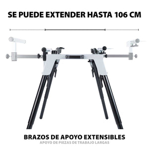 Diseñado para proporcionar estabilidad a piezas grandes y pesadas, así como muchas otras marcas. Es ligero, resistente y compacto, soportando hasta 225 kg de carga. Sus patas ajustables permiten configurar la altura de 595 a 815 mm, y sus brazos de trabajo extensibles aumentan el área de soporte hasta 106 cm. Incorpora un tope final para cortes repetidos rápidos y fáciles. Compatible con varios modelos de sierras Evolution.