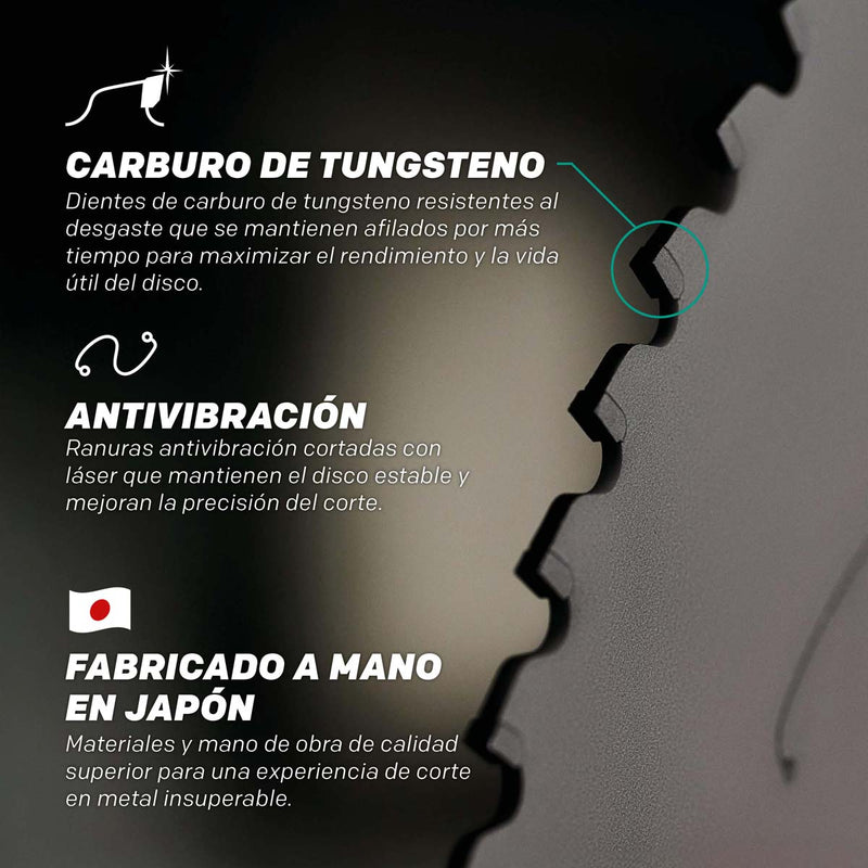 - Cortes impecables: Sus 100 dientes de carburo de tungsteno reducen la acumulación de calor y evitan que el material se adhiera a la hoja, logrando cortes limpios y sin necesidad de retrabajos.