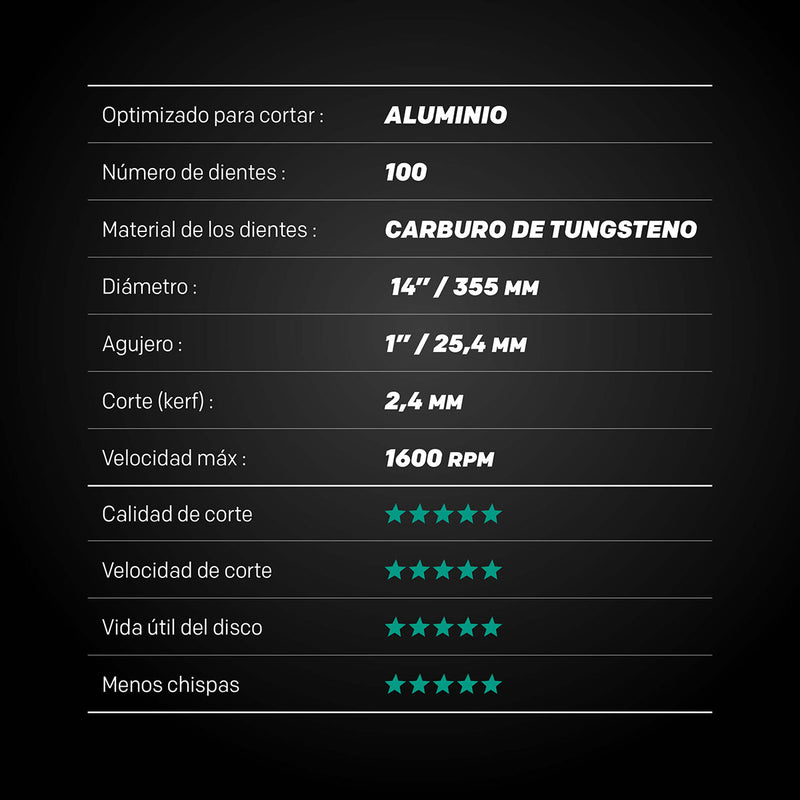 Disco EVOMAX de 355 mm de 100 dientes para Corte Profesional de Aluminio de Alta Resistencia