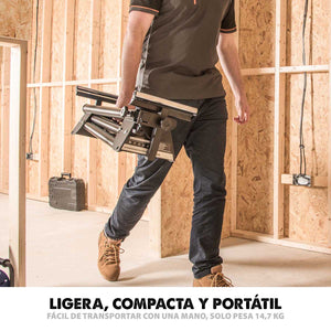 El soporte universal para ingletadoras es ideal tanto para uso doméstico como en obras. Con un peso de solo 15,5 kg, es lo suficientemente ligero como para transportarlo con una sola mano, pero puede cargar hasta 150 kg y piezas de hasta 3 m de longitud.