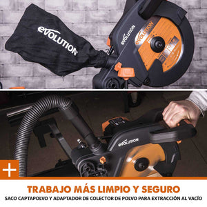 Optimiza tu espacio de trabajo con el increíble paquete Evolution, diseñado para profesionales de la construcción y entusiastas del bricolaje. Este pack incluye la potente Ingletadora R255SMS+, equipada con una hoja multi-material de alta precisión, una bolsa recolectora de polvo y prácticas abrazaderas de sujeción.