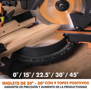 - Cortes inclinados de 45° a 45° y ángulos de inglete de 50° a 50°, con topes de inglete a 0°, 15°, 22,5°, 30° y 45° a ambos lados.