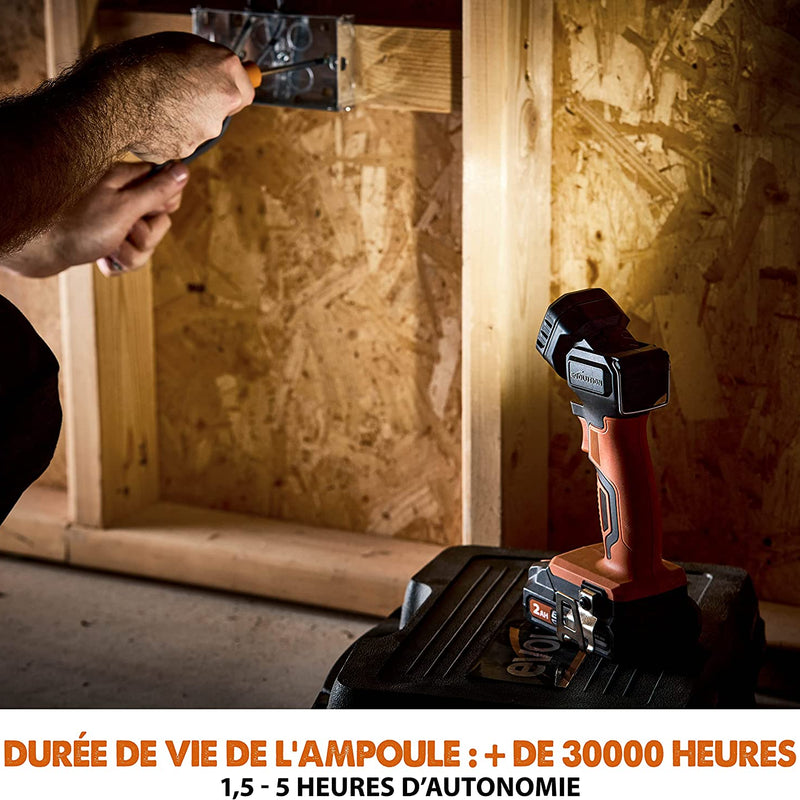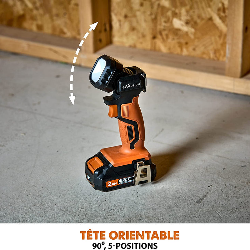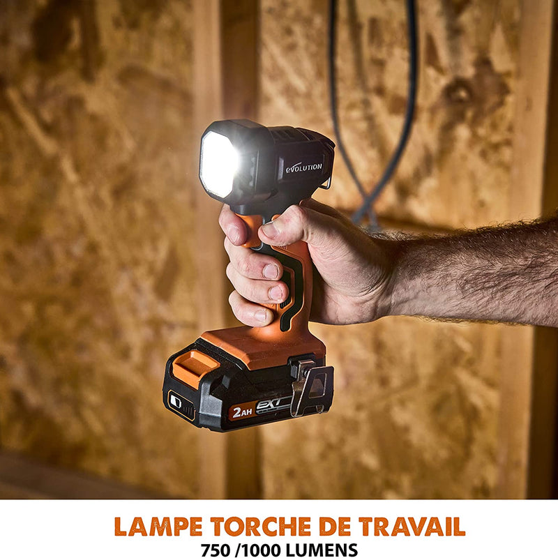 La linterna de trabajo Evolution Cordless R1000TOR-Li es el accesorio perfecto para uso comercial, en casa y en ocio, tanto en interiores como en exteriores. Compacta, potente y con largos tiempos de funcionamiento, iluminará incluso los espacios más oscuros. Utilizando la eficiente tecnología LED Chip On Board, el R1000TOR-Li emite un haz amplio, perfecto para iluminar en interiores y exteriores. Con dos niveles de iluminación que ofrecen 750 o 1,000 lúmenes, puedes elegir entre la máxima luz y los máximos tiempos de funcionamiento de la batería. Con una huella compacta, un lazo para el cinturón, un lazo de suspensión en la parte superior y una cabeza pivotante ajustable a 90⁰ con 5 posiciones de clic, el R1000TOR-Li seguramente encontrará un lugar en cualquier ubicación, taller, hogar, vehículo de trabajo o caravana. La versión cargada se incluye con nuestro paquete de batería R18BAT-Li2 de 2Ah y el cargador rápido de puerto único R18RCH-Li, que te llevará de cero a completamente cargado en solo 30 minutos. Todas las herramientas eléctricas de batería EXT Cordless Li-ion de Evolution son compatibles con todas las baterías EXT, por lo que puedes compartir entre múltiples herramientas para una máxima versatilidad. Si deseas una linterna de trabajo ligera, potente y portátil para uso laboral, en casa y en ocio, el R1000TOR-Li de Evolution lo ofrece. Funciona con todas las baterías EXT de 18v de Evolution y Erbauer y ofrece largos tiempos de funcionamiento y mucha iluminación a un gran precio.